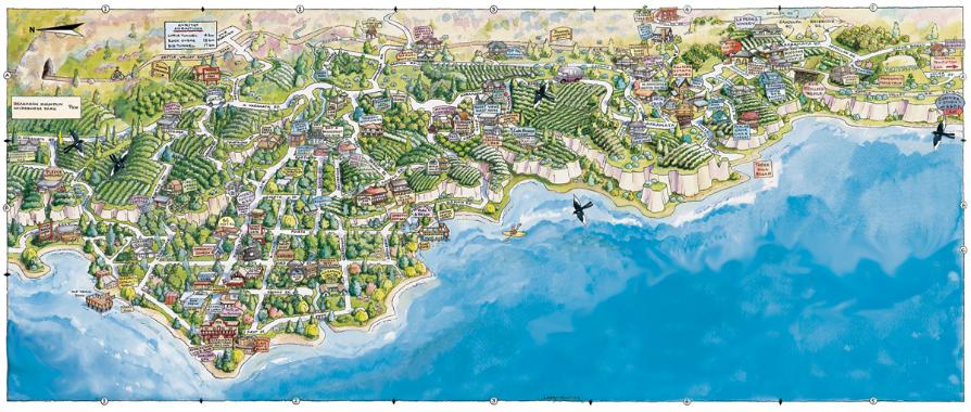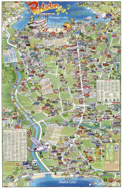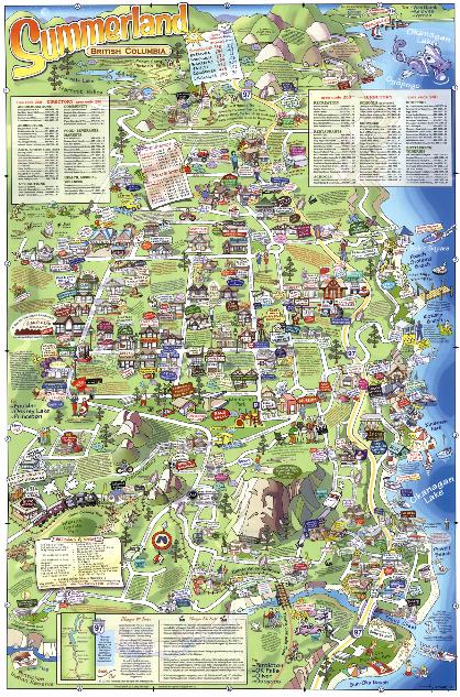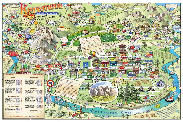 community's features, shops, accommodations, history and layout of roads